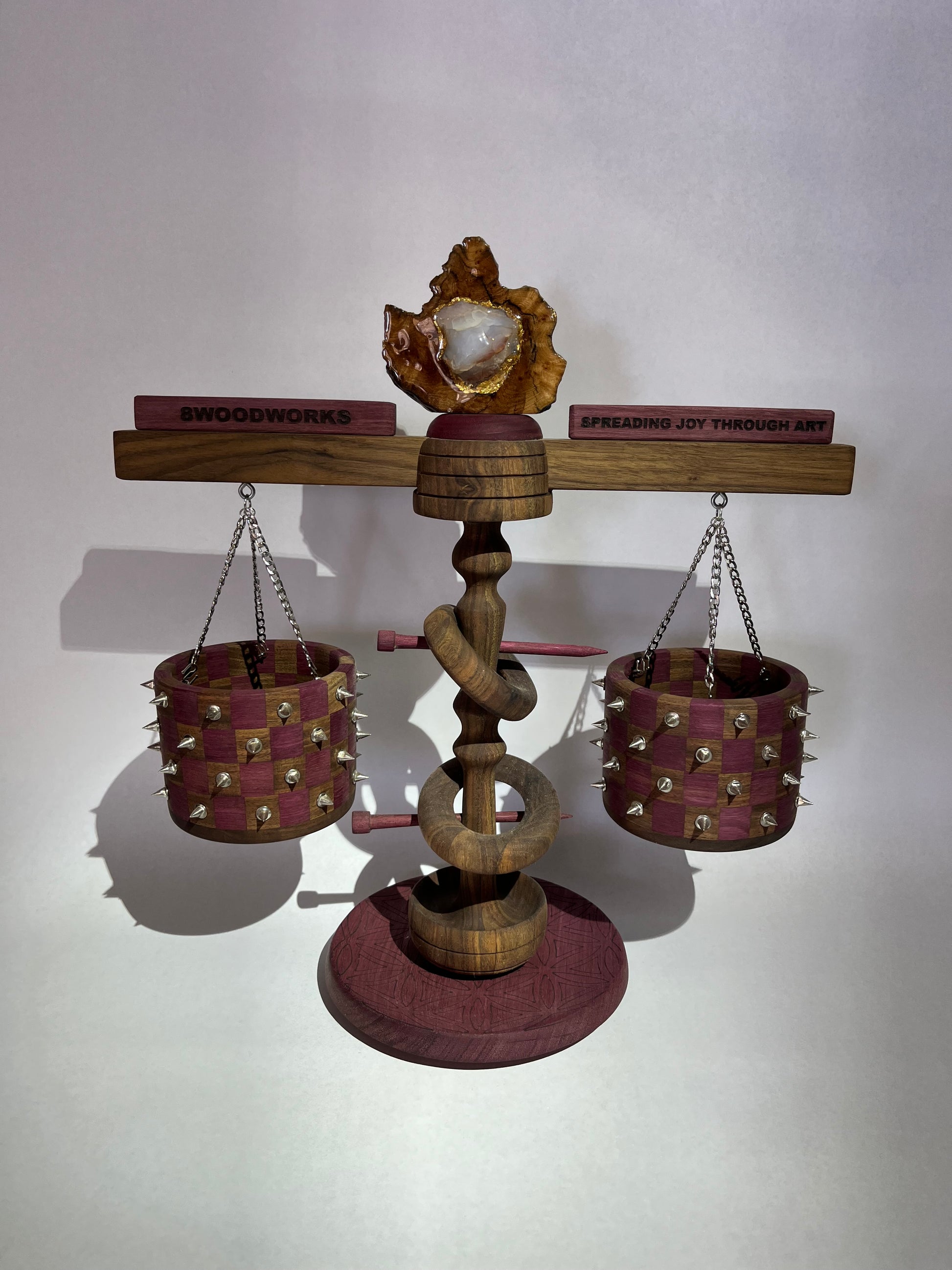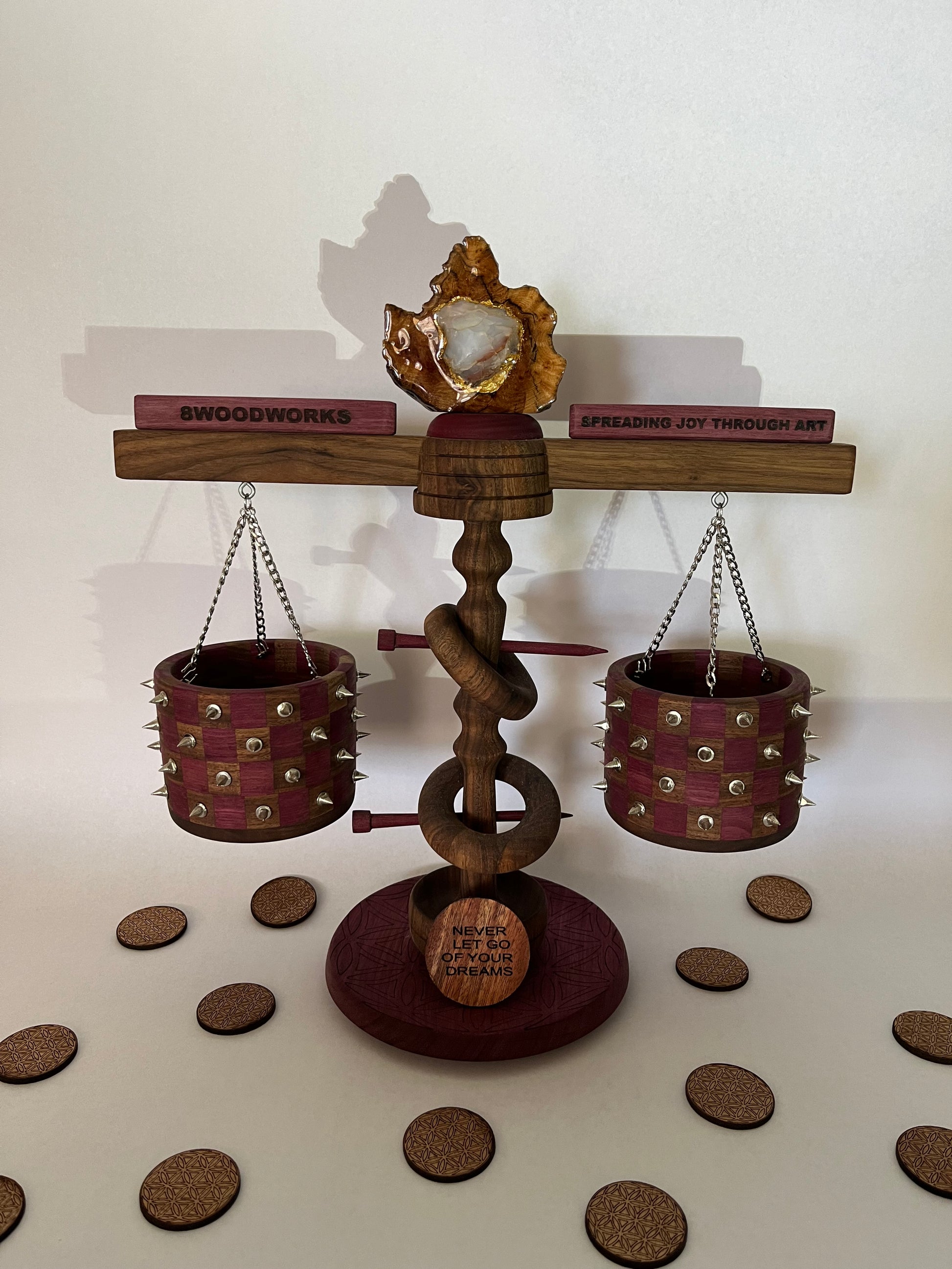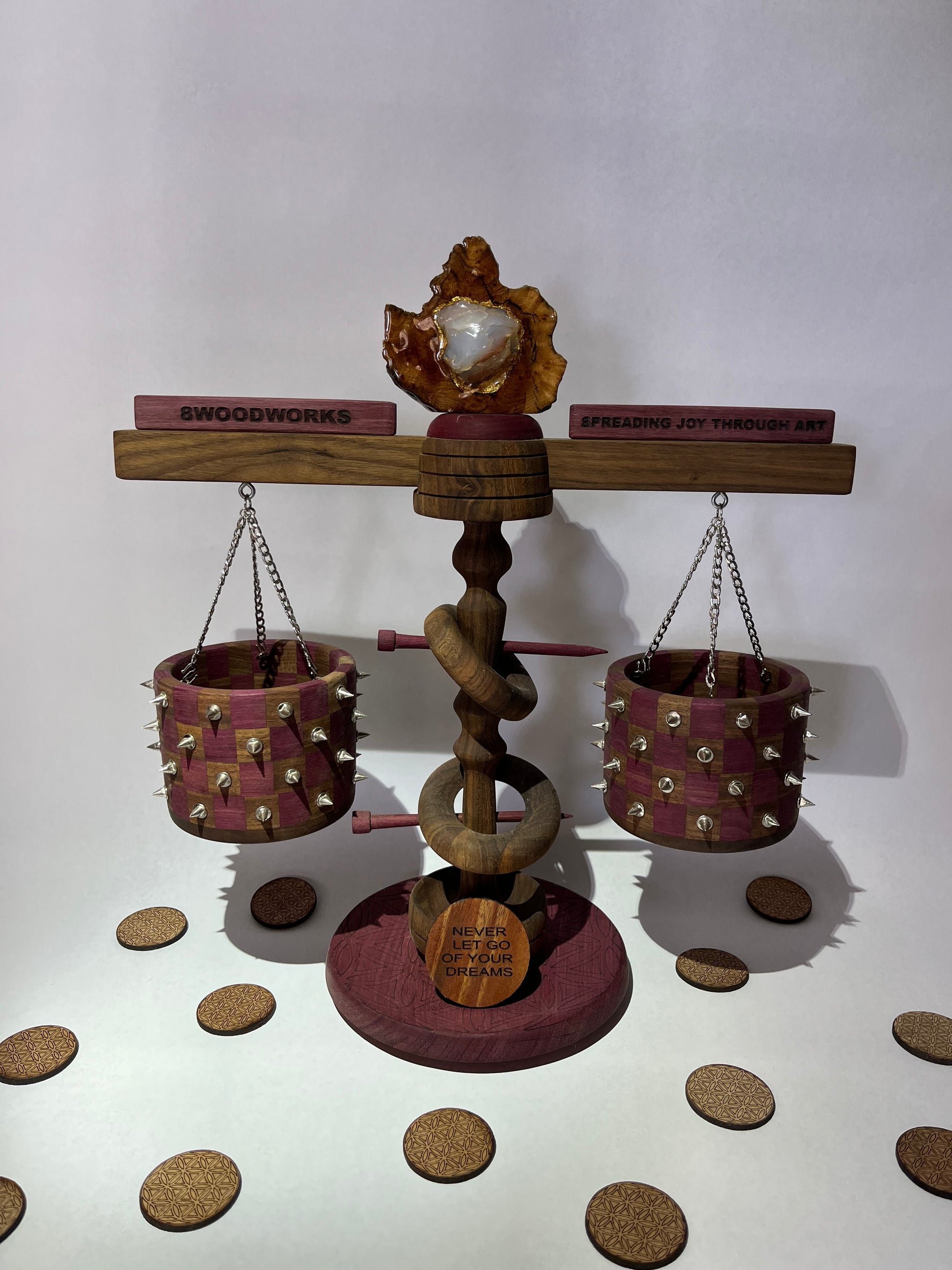 "Stand out with this unique Balance/Justice Scale adorning spikes and intricate flower of life sculpture. Handcrafted from Purple Heart and walnut wood, this piece is perfect for those who crave individuality and adventure. Take a risk and add a bold touch to your home decor!"