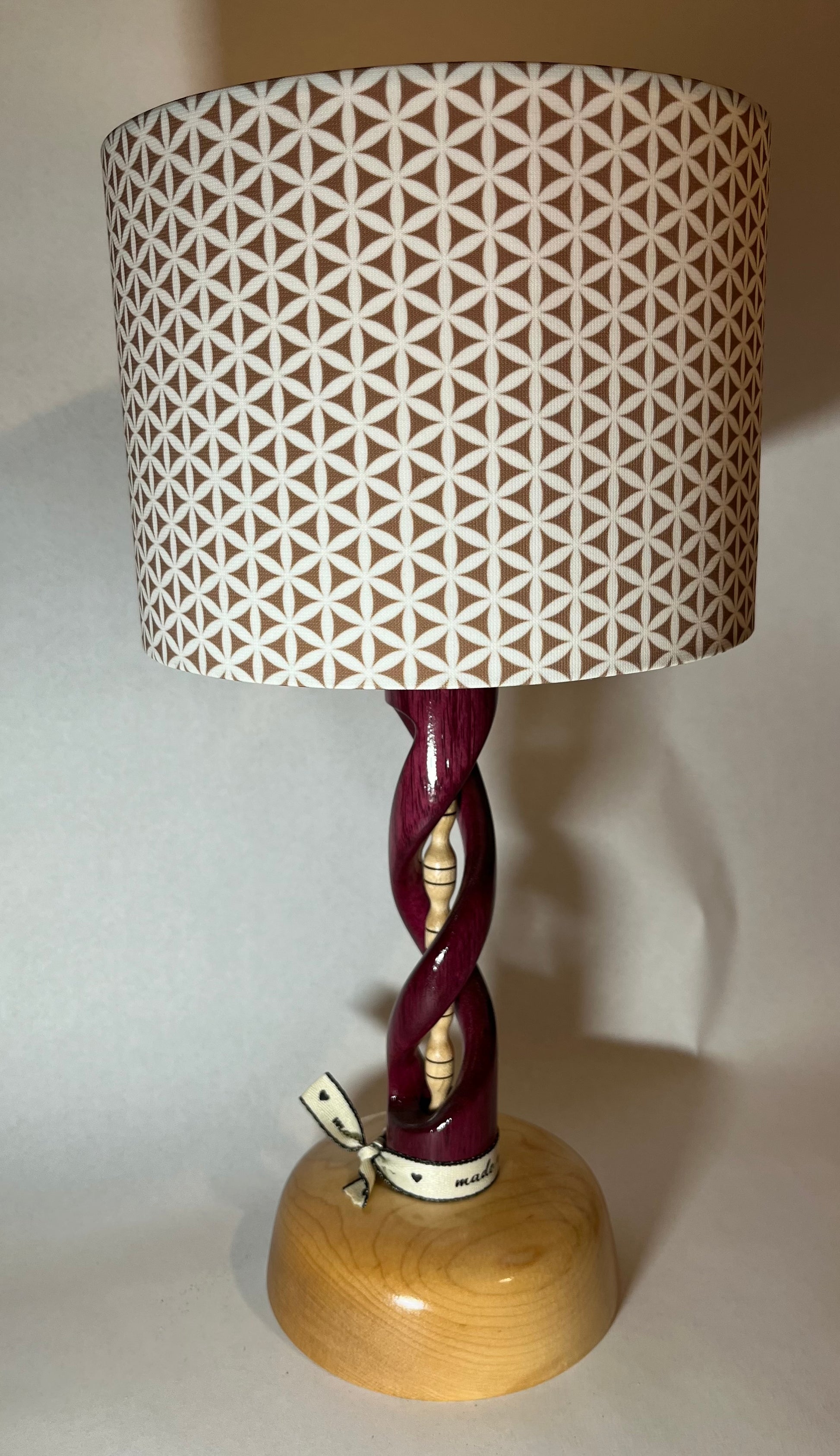This hand-carved desk lamp features a unique spiral design crafted from Purple Heart and maple wood. The blend of these two high-quality materials adds both durability and elegance to any workspace, making it the perfect addition to your home or office.