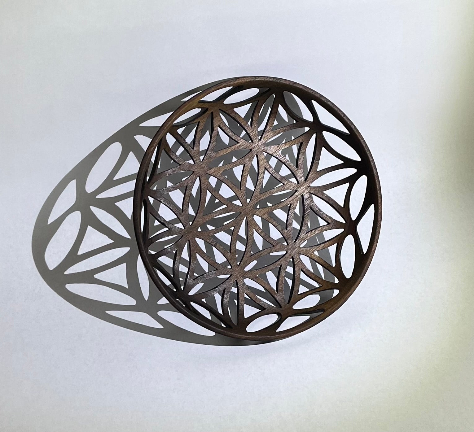 This walnut bowl is truly one of a kind, featuring a stunning "flower of life" illusion carved into its surface. Perfect for adding a touch of unique decoration to any space, this bowl is a work of art that will surely spark conversations. Don't miss out on this rare find!
