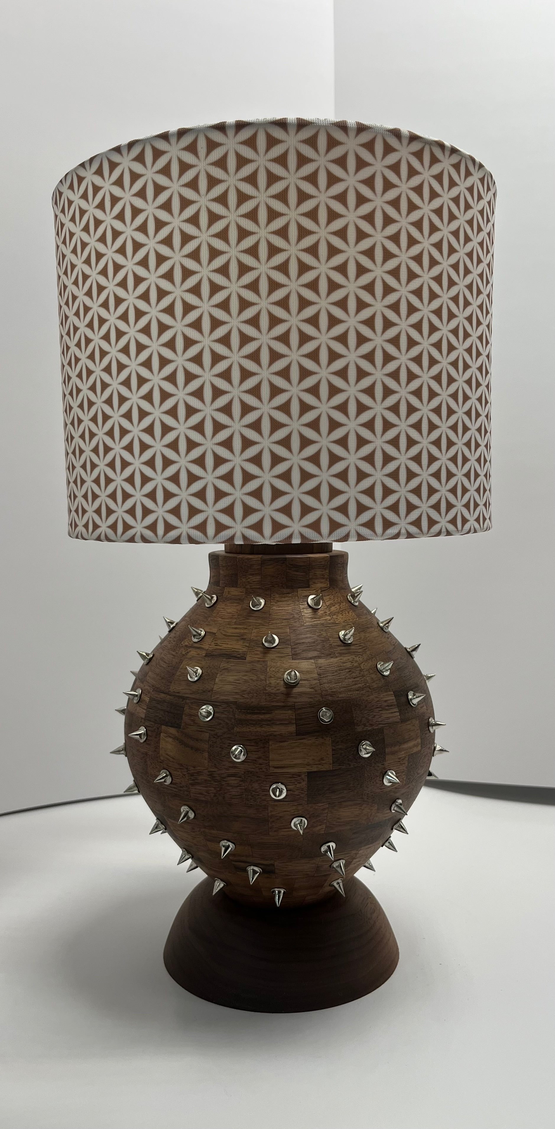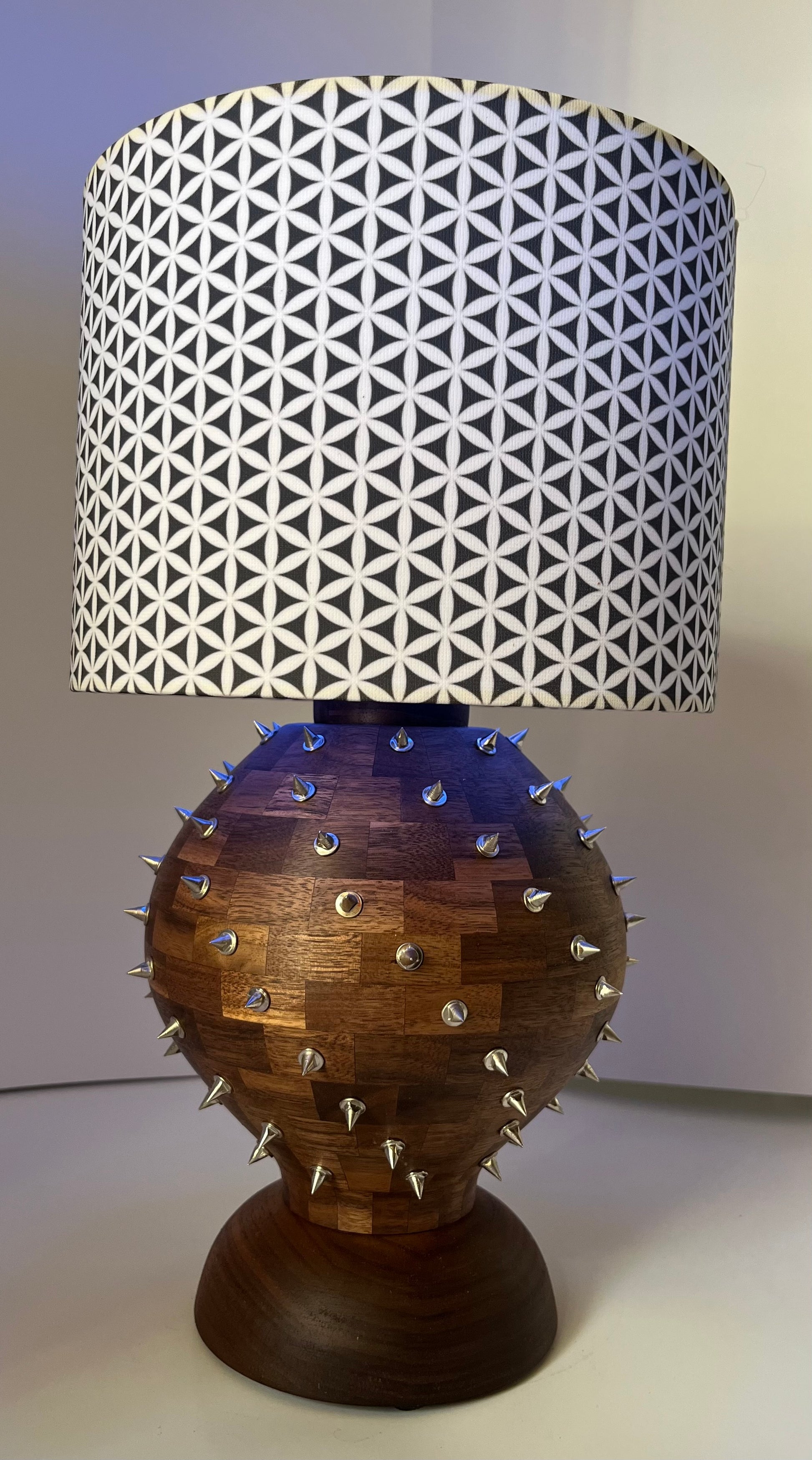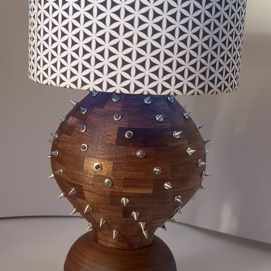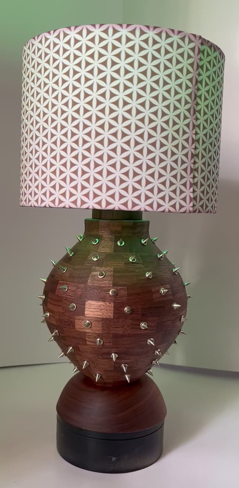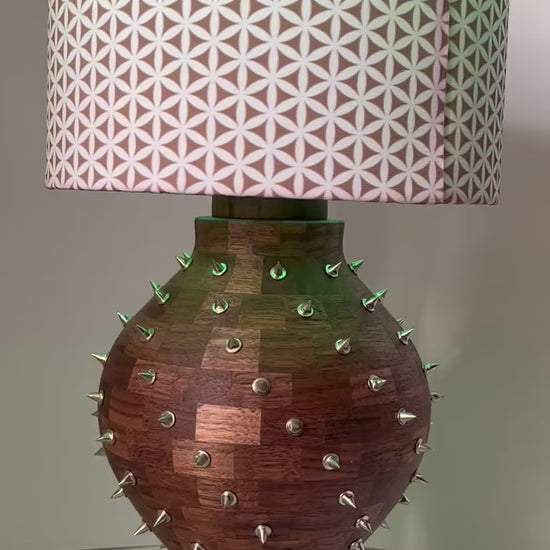 Transform your space with this one-of-a-kind creation! Handmade with walnut segments and spiked accents, this lamp is truly unique. The custom seed of life lamp shade adds a touch of elegance. Comes with 2 bulbs and a remote for added convenience. Bring some personality to your space with this quirky and stylish lamp!